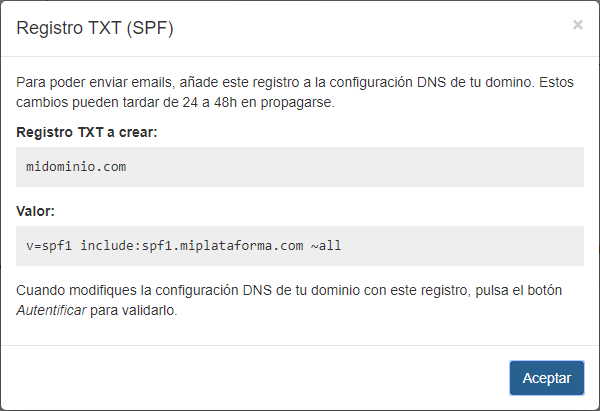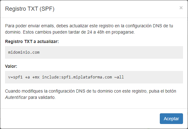 En este caso, deberás actualizar tu registro TXT con el que te proponemos, que es una fusión del anterior con el nuevo que has de añadir.