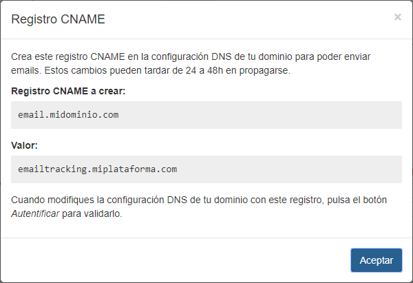 Para ver que valores tienes que añadir por cada uno de los registros, debes hacer clic en cada uno de los botones que aparecerán junto al dominio a autentificar. En la ventana emergente te mostraremos el nombre del registro que debes crear en la configuración DNS de tu dominio, y su valor.
