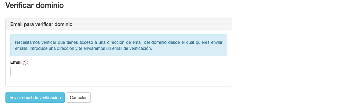 - Introduce el email al que tengas acceso con el dominio que quieres verificar y haz clic en 'Enviar email de verificación'.