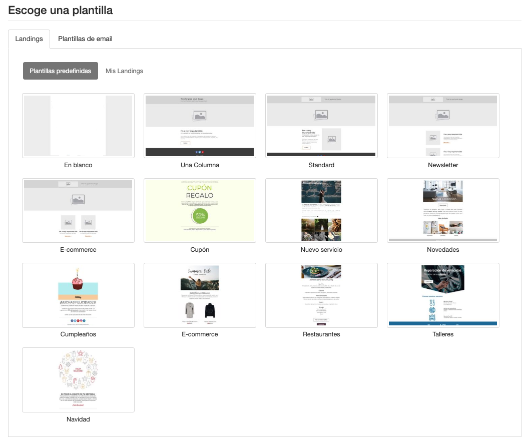 Para crear una nueva Landing, dirígete a crear nueva Landings. Tienes la posibilidad de escoger una plantilla en blanco o una de las plantillas predefinidas que ponemos a tu disposición. También puedes guardar tus propias Landings como plantillas.