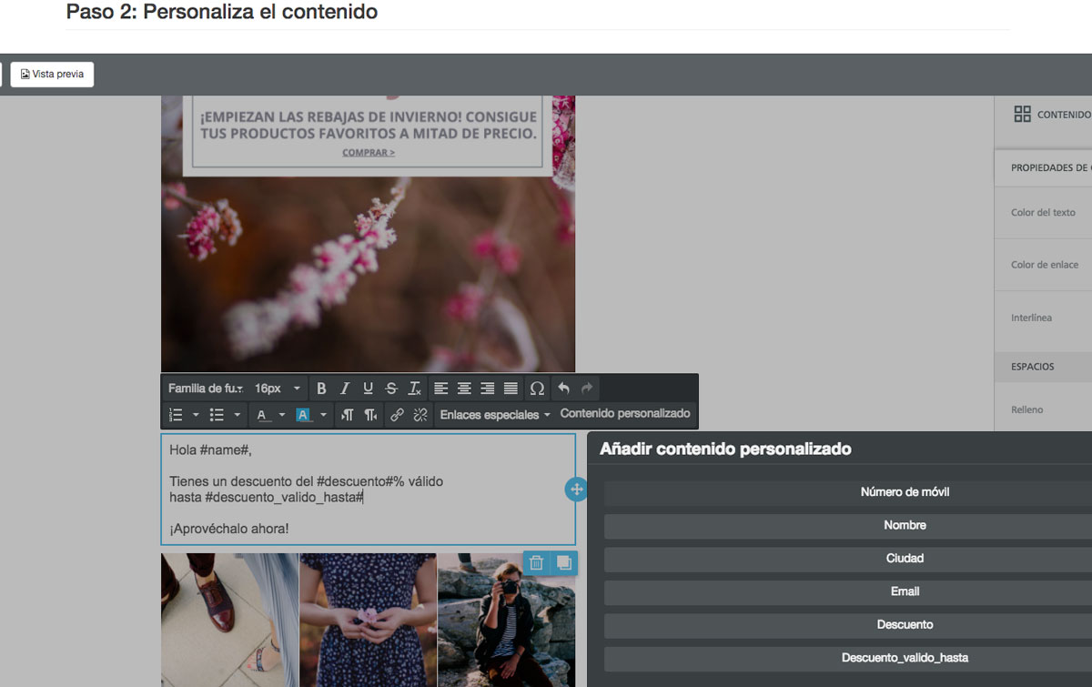 Puedes añadir campos personalizados, de esta manera, cuando realices un envío que incluya una Landing, se sustituirán los campos personalizados por los de cada contacto, consiguiendo así una landing única.