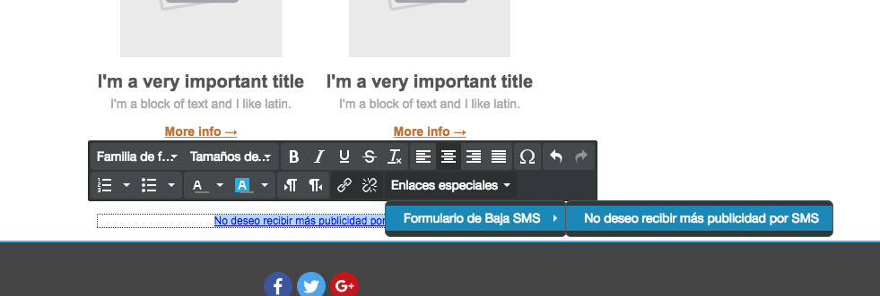 Pulsa sobre el botón de 'Enlaces especiales', 'Formulario de Baja SMS' y finalmente pulsa en 'No deseo recibir más publicidad por SMS' para añadir el enlace de baja a tu Landing.